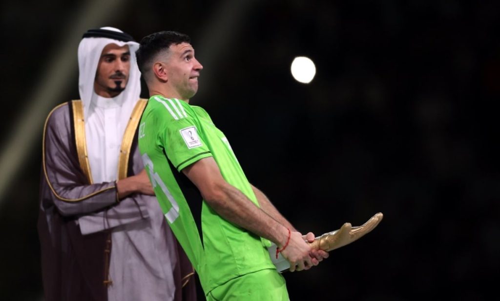Emiliano Martinez është një personazh shumë i veçantë dhe këtë e ka treguar në fushën e lojës me gjeste të çuditshme. Kërcimet apo provokimet ndaj kundërshtarëve kanë qenë të vazhdueshme në sfida të ndryshme, por veprimi i tij pasi fitoi “Dorashkën e Artë” në Botëror, po bën xhiron e rrjetit.Argjentinasi mori trofeun që i jepet portierit më të mirë të turneut nga drejtuesit e lartë të FIFA-s dhe sheikët e Katarit pak çaste para ceremonisë së dorëzimit të Kupës së Botës.