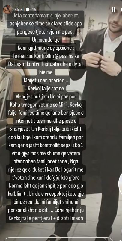 “Jeta është tamam si një labirint, asnjëherë nuk e dimë se çfarë sfide apo pengese tjetër vjen më pas. Unë mendoj që kemi dy opsione: të marrin kontrollin pasi kemi dalë jashtë tij dhe e dyta i bie të mbijetosh nën presion. Kërkoj falje, nuk jam unë ai por koha tregon më së miri. I kërkoj falje familjes sime që janë bërë pjesë e internetit tashmë dhe pjesë e sharjeve. Unë i kërkoj falje publikisht të gjithë atyre që i kam ofenduar familjen por kam qënë jashtë kontrollit sepse u bë një vit e gjysmë, mos më shumë, që vetëm ofendohen familjarët tanë nga njerëz që si duket i kanë bërë mirë llogaritë me veten e tyre dhe kur i dëgjoj këto gjëra, normalisht janë shpifje por çdo gjë ka një limit. Unë do e respektoj këtë gjë bindshëm, lërini familjet, shihemi personalisht një ditë. Edhe njëherë, ju kërkoj falje, për të tjerat, i di Zoti i madh”- ka shkruar Stresi.