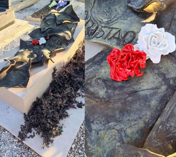 Në foto shihet se mbi varret e prindërve janë skulpturuar dy trëndafila, një i bardhë dhe një i kuq, teksa Rama rrëqeth me fjalët që shkruan.