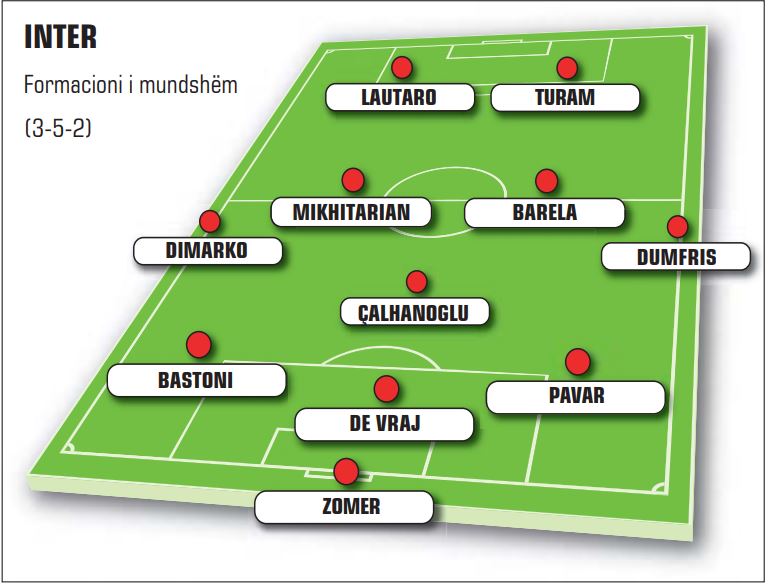 Mikhitarian do t’i bashkohet Barelës dhe Çalhanoglusë, që në krah do të shoqërohen nga Dimarko dhe Dumfris. Bastoni do të rimarrë vendin e tij në të majtë të mbrojtjes pas pushimit ndaj Salernitanës dhe në qendër pritet të jetë sërish De Vraj.