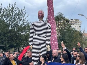 Siç shihet dhe në foto, qytetarët kanë lart dy manekinë me veshje të burgosurish, ndërsa u kanë vendosur atyre foton e kryeministrit Edi Rama dhe ish-agjentit të FBI-së, McGonigal.