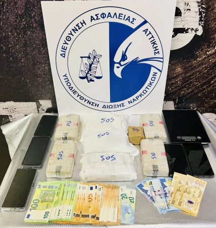 Gjatë kontrollit të banesës së tij në Kolono të Athinës, u gjetën dhe sekuestruan 3 kg 550 gram heroinë, 185 gram hashash çokollate, 1 peshore elektronike, 2500 euro, 2100 lek shqiptare dhe 5 celularë.