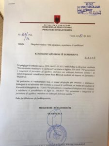 Prokuroria e Përgjithshme i ka nisur një shkresë KQZ për miratimin e rezultateve të verifikimit në zbatim të ligjit nr.138/2015 për garantimin e integritetit të personave që zgjidhen, emërohen ose ushtrojnë funksione publike’ të Arsen Tare Belaj, kandidat për deputet i koalicionit ABEOK, në zgjedhjet e 25 prillit. Prokuroria i kërkon KQZ verifikimin e tij dhe informimin për rezultatin.