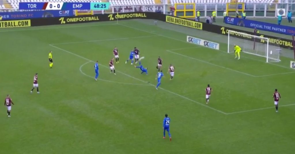 Gjatë një krosimi në zonë të Ebuehi, ish-sulmuesi i Interit dhe i Milanit ka shënuar një “perlë” me roveshatë duke shtangur portierin serb të Torinos, Vanja Milinkoviç-Saviç.