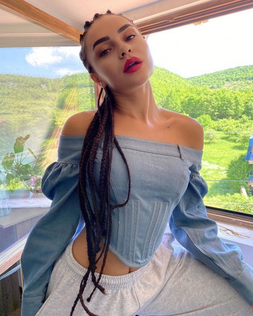 Këngëtarja, edhe kësaj here kishte vendosur gërsheta derisa duket se është në një vend me ajër të pastër, pasi që peizazhi pas saj është malor.