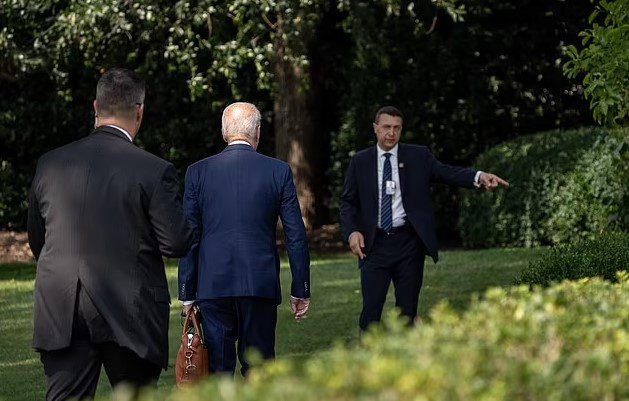 Në vend të kësaj, Biden shihet duke ndjekur agjentin në lëndinë dhe përmes kopshtit në pronën presidenciale.