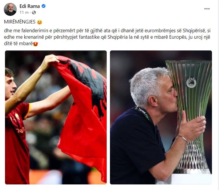 Një ditë pasi Roma u shpall kampione e “Conference League” e cila u zhvillua në Tiranë, kryeministri Edi Rama ka bërë një postim në Facebook, duke shprehur edhe falënderimet e tij.