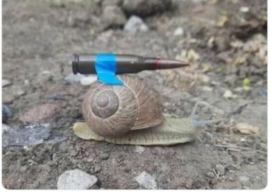 “Armët gjermane për Ukrainë që janë dërguar’ është mbishkrimi i një foto e cila tregon një kërmill me një predhë.