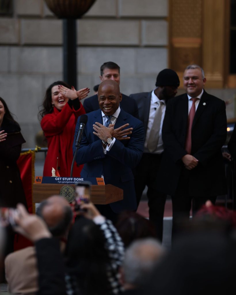 Teksa mori fjalën në ceremoni, kryebashkiaku Adams bëri simbolin e shqiponjës me duar, çka u pasua me duartrokitje nga të ftuarit e pranishëm.“Nuk mund të ishit këtu për një ceremoni të flamurit, pa ngritur edhe ne flamurin tonë. Aktualisht, djali im është në Shqipëri për të performuar dhe treguar talentin e tij. Kështu që ai më ka bërë me dije që unë nuk jam i vetmi që kam talent”, tha qytetari i parë i Nju Jorkut. “Çfarë komuniteti! Ky komunitet ka shumë rëndësi për mua.