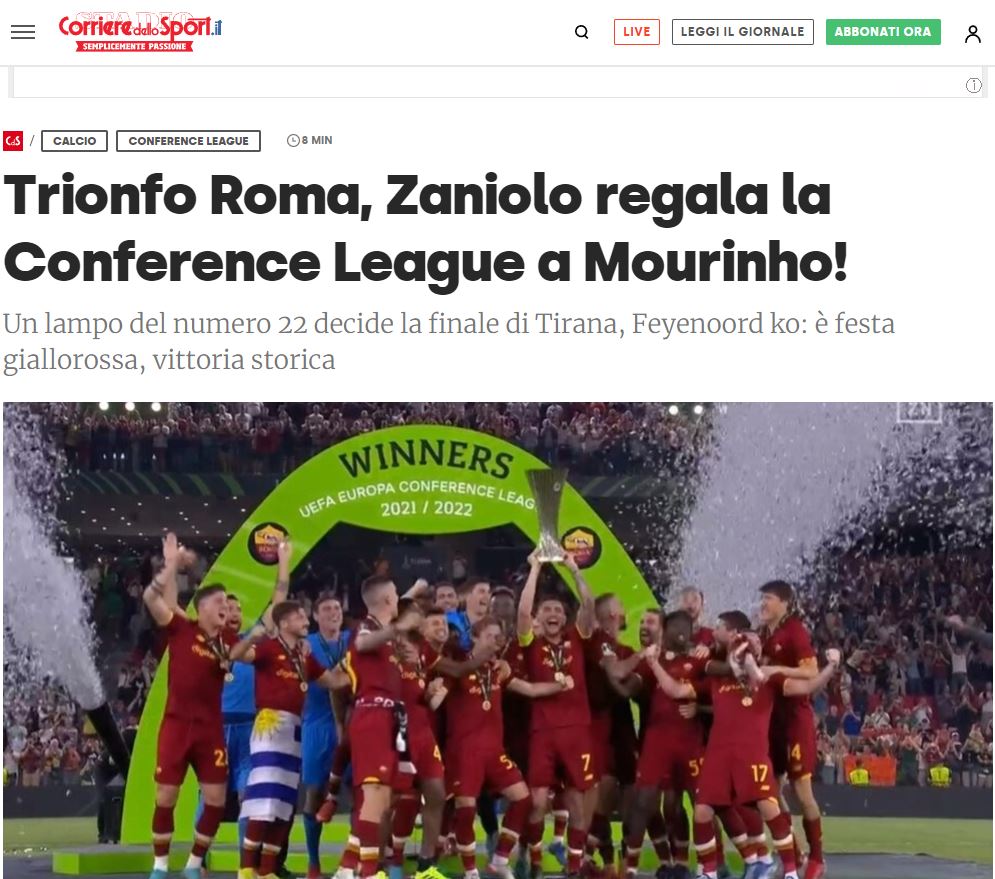 Ka qenë 24 maji 2008, katërmbëdhjetë vjet më parë, kur Francesco Totti ngriti në qiell Kupën e Italisë, trofeun e fundit për Romën. Sonte është Lorenzo Pellegrini , me shiritin e kapitenit në fushë dhe nën sytë e legjendës dhe të gjithë tifozëve, ai që e pason atë duke ngritur një tjetër kupë evropiane. Është fitorja e Romës së José Mourinhos , tashmë trajneri i vetëm i cili ka fituar të gjithë trofetë kontinental. Është fitorja e Nicolò Zaniolo , ylli i mbrëmjes me rrufenë e lëshuar ndaj Feynoord.