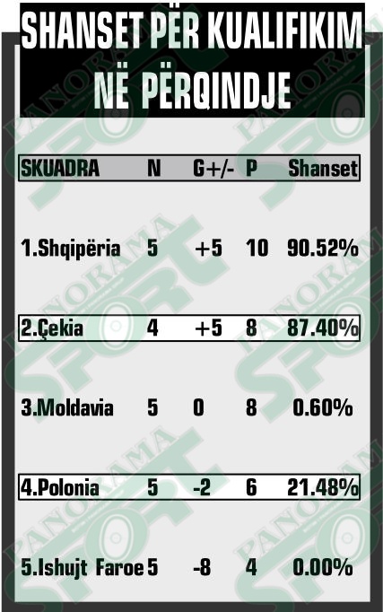 Dhjetë pikë dhe kryesuese në grup, kuqezinjve u mjaftojnë vetëm 5 pikë në tri ndeshjet e mbetura për të parë veten në Gjermani qershorin e ardhshëm, teksa do të përballet me Çekinë në muajin tetor, ndërsa në nëntor dy sfidat e tjera me Moldavinë në transfertë.