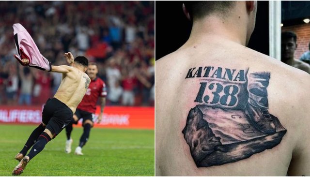 Mirind Daku ishte heroi i mbrëmjes së djeshme i cili dyfishoi shifrat ndaj Polonisë. Ajo çfarë u vu re ishte tatuazhi i tij “Katana 138”, i cili është dedikim për një prej komandantëve më të shquar të UÇK, heroin Agim Ramadani!Katana ra dëshmor më 11 Prill 1999 në Koshare.